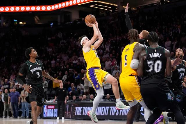 湖人和森林狼這場比賽,在里夫斯投進絕殺之前,幾乎就是湖人球迷最熟悉也是最痛苦的比賽流程。第二節(jié)和第三節(jié),湖人打得順風順水,里夫斯今天雖然被針對,但其他人足夠爭氣。